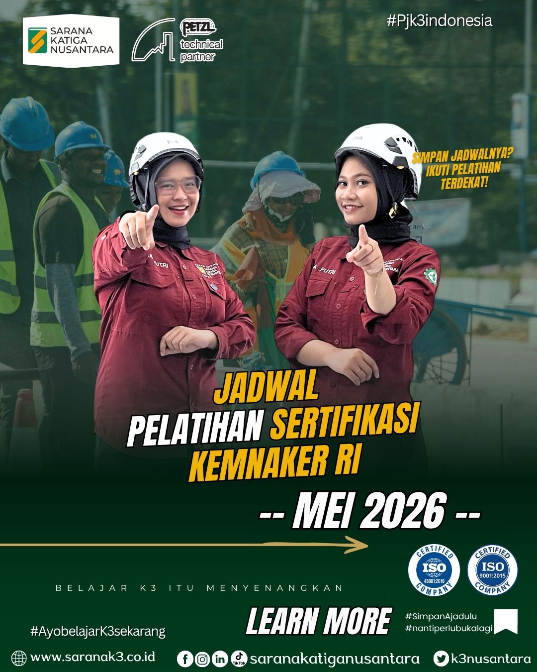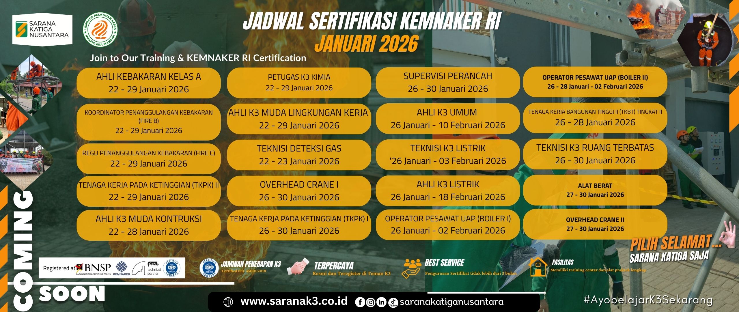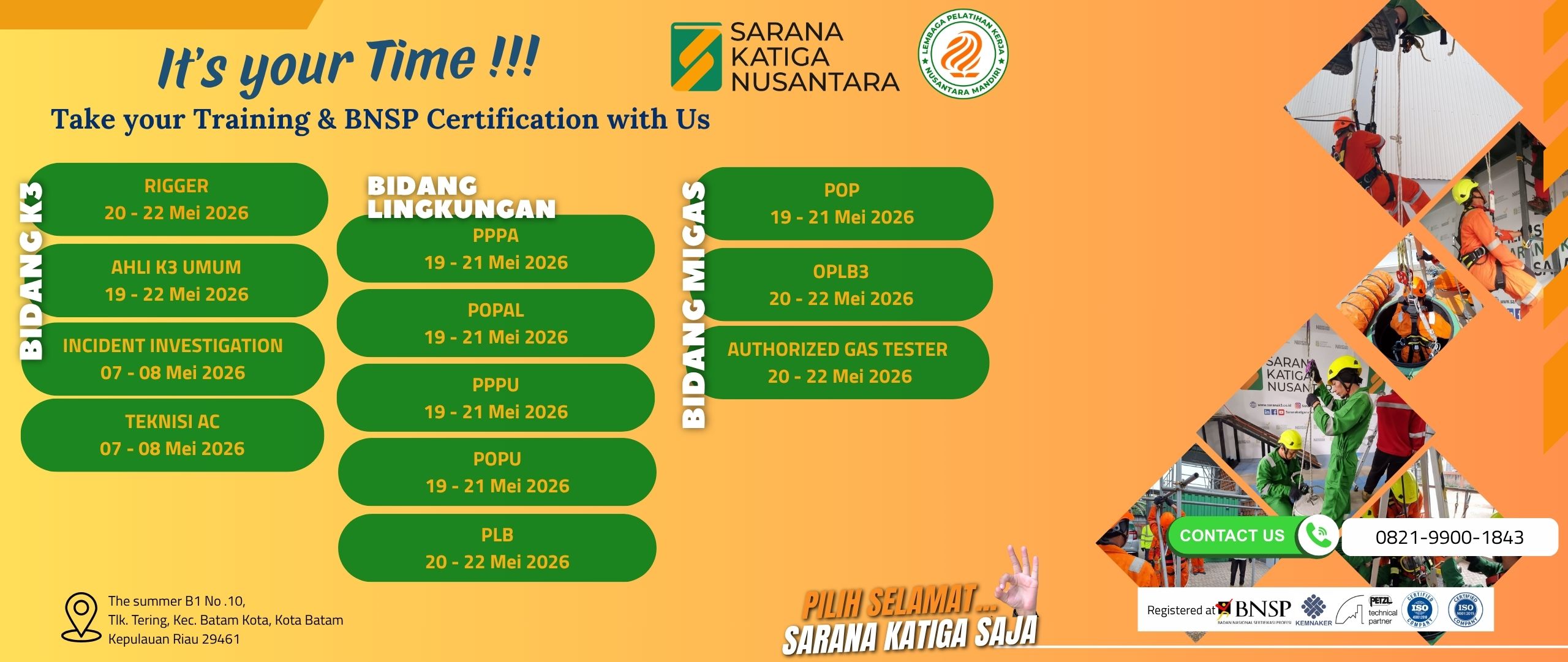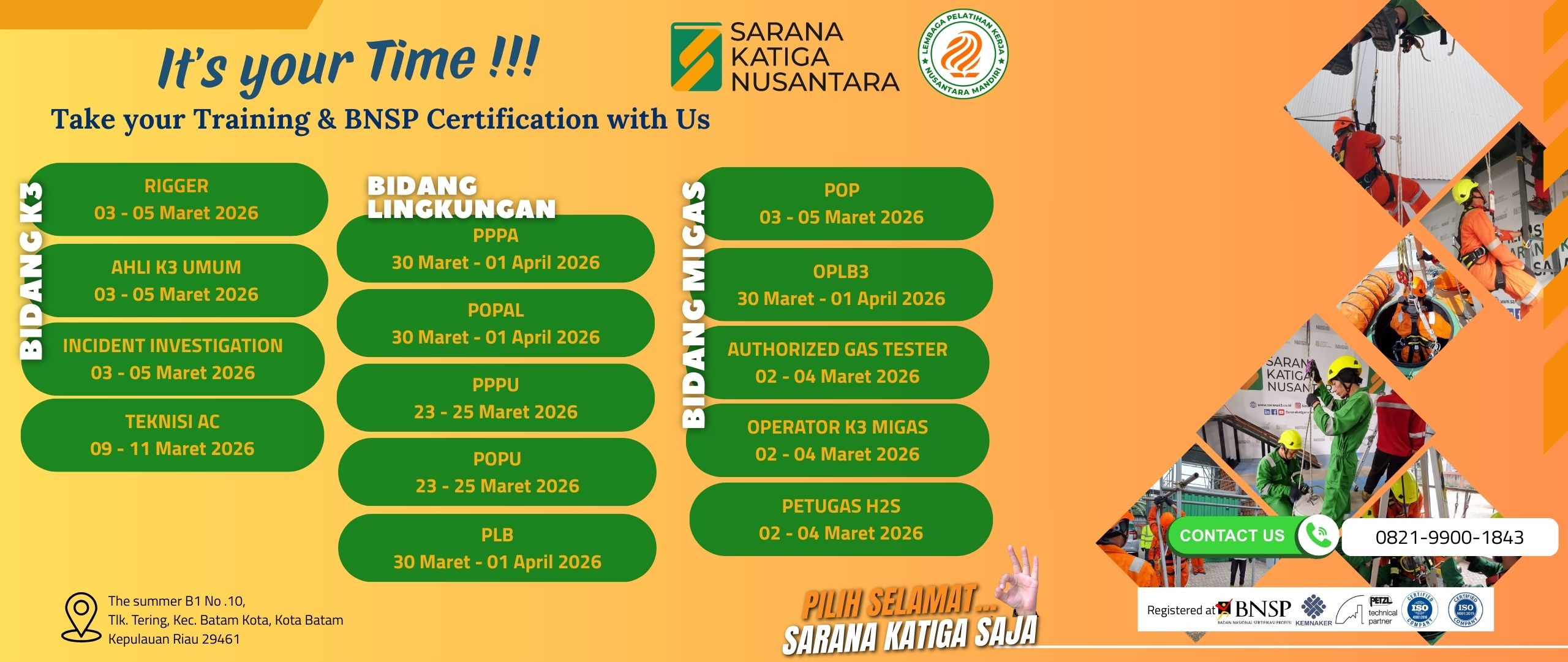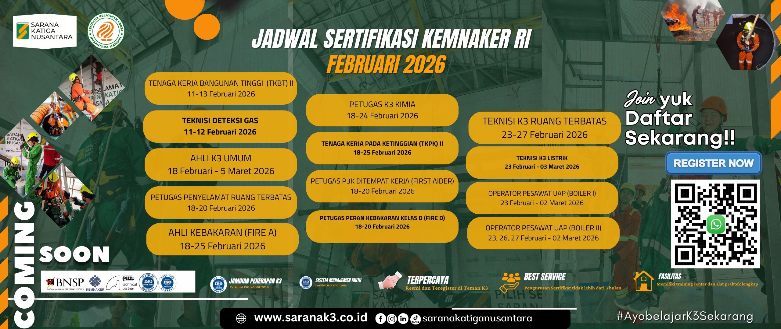 PT Sarana Katiga Nusantara adalah lembaga pelatihan dan sertifikasi K3 Umum terbaik No.1 di Indonesia, berizin resmi Kemnaker RI dan terakreditasi BNSP nasional. Sebagai pusat pelatihan K3 di Indonesia, kami menghadirkan program pelatihan dan sertifikasi K3 bersertifikat Kemnaker RI dan BNSP yang diakui secara nasional untuk meningkatkan kompetensi tenaga kerja profesional di berbagai sektor industri, seperti migas, konstruksi, manufaktur, listrik, transportasi, pertambangan, dan logistik. Setiap program dirancang sesuai standar regulasi keselamatan dan kesehatan kerja (K3) agar perusahaan dan pekerja memiliki sertifikat kompetensi resmi yang diakui secara nasional. Layanan kami mencakup pelatihan & sertifikasi Kemnaker RI (Ahli K3 Umum, K3 Listrik, K3 Konstruksi, K3 Kebakaran, K3 Lingkungan, K3 Bekerja di Ketinggian, Pesawat Uap & Bejana Tekan, serta Pesawat Angkat & Angkut) dan sertifikasi BNSP di bidang Migas, Pertambangan, Lingkungan, Industri, serta Keamanan Pangan & Halal. Didukung instruktur berpengalaman, metode pelatihan offline, online, dan hybrid, serta jangkauan nasional, PT Sarana Katiga Nusantara siap menjadi mitra terpercaya dalam pengembangan SDM unggul dan kompeten di bidang Keselamatan dan Kesehatan Kerja (K3) di seluruh Indonesia.