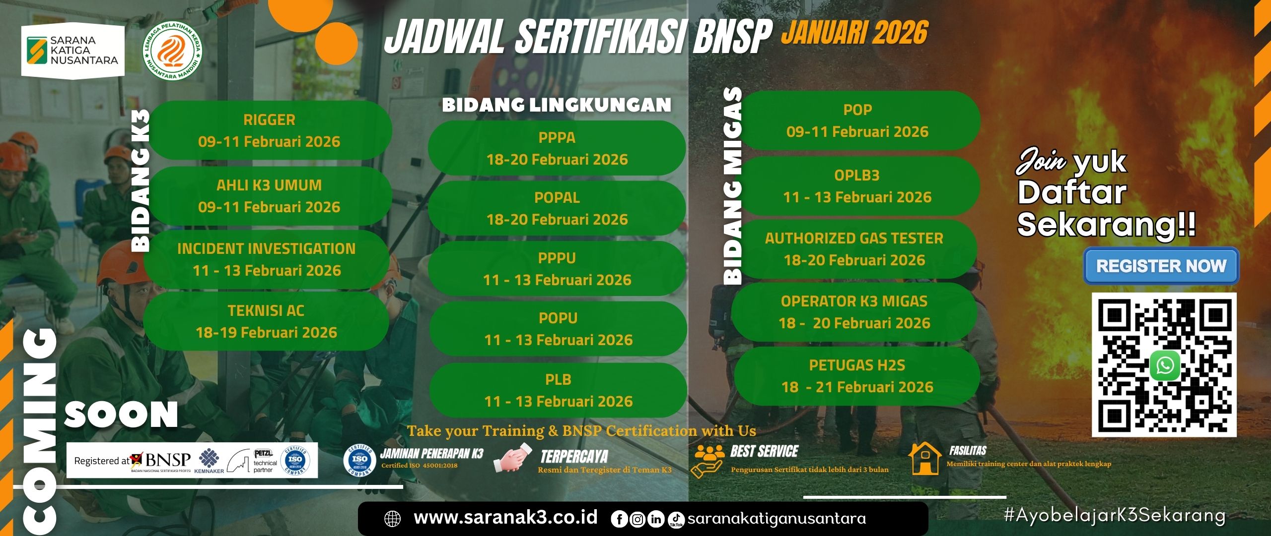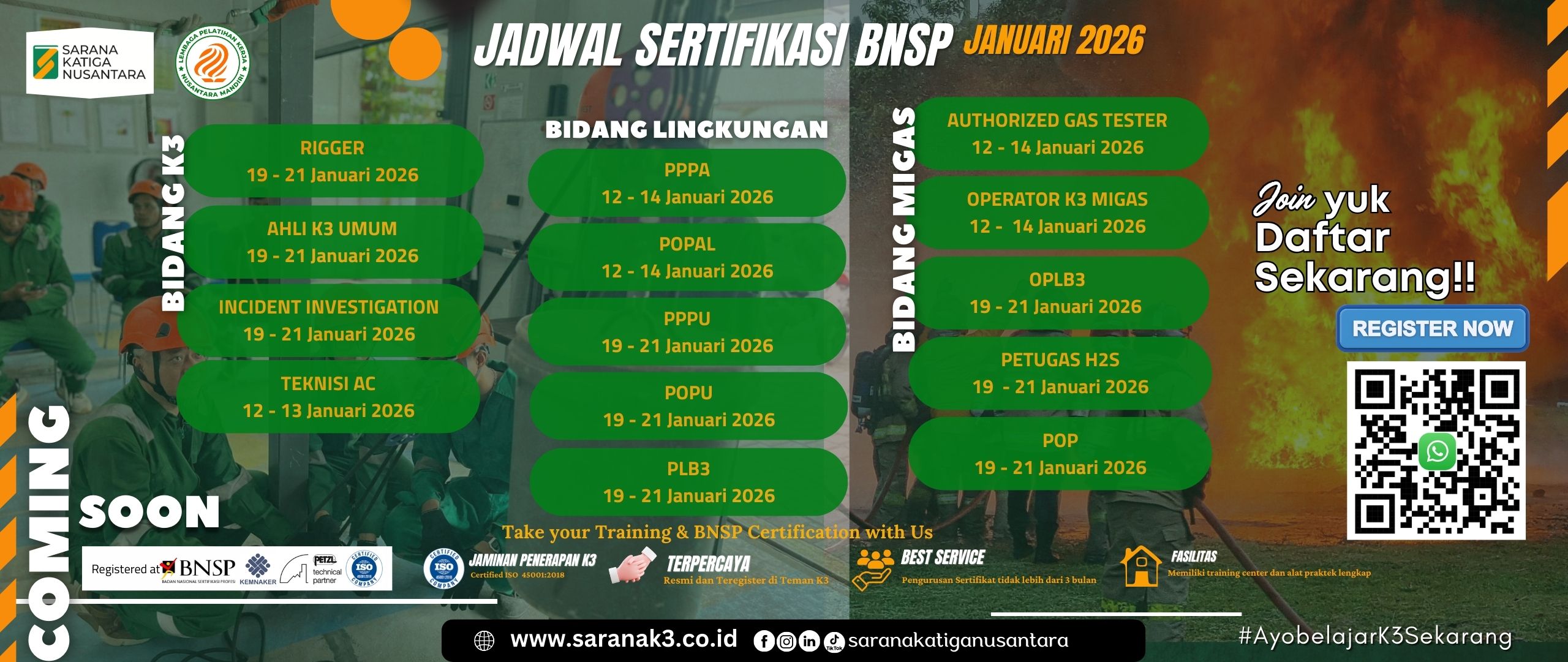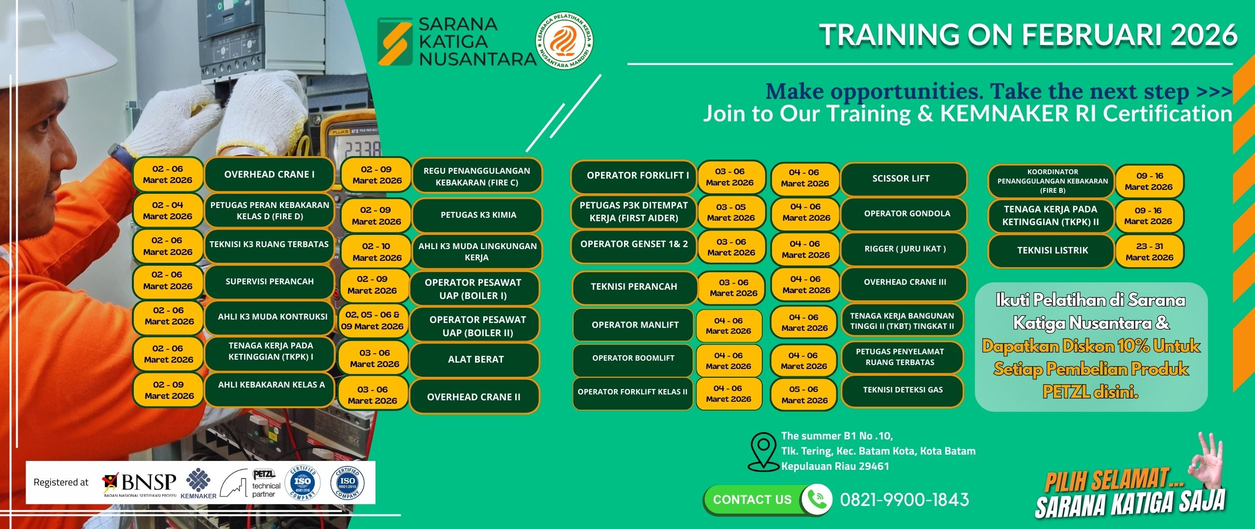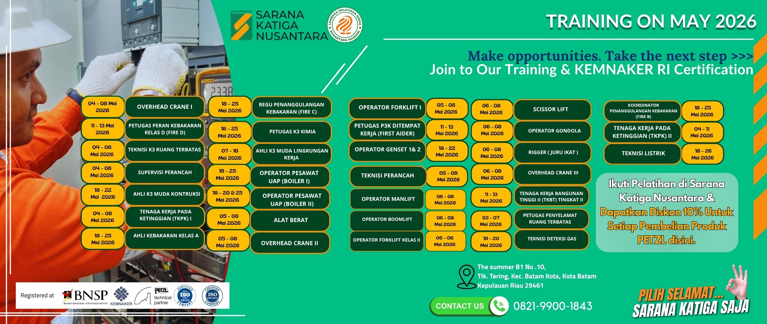 PT Sarana Katiga Nusantara adalah lembaga pelatihan dan sertifikasi K3 Umum terbaik No.1 di Indonesia, berizin resmi Kemnaker RI dan terakreditasi BNSP nasional. Sebagai pusat pelatihan K3 di Indonesia, kami menghadirkan program pelatihan dan sertifikasi K3 bersertifikat Kemnaker RI dan BNSP yang diakui secara nasional untuk meningkatkan kompetensi tenaga kerja profesional di berbagai sektor industri, seperti migas, konstruksi, manufaktur, listrik, transportasi, pertambangan, dan logistik. Setiap program dirancang sesuai standar regulasi keselamatan dan kesehatan kerja (K3) agar perusahaan dan pekerja memiliki sertifikat kompetensi resmi yang diakui secara nasional. Layanan kami mencakup pelatihan & sertifikasi Kemnaker RI (Ahli K3 Umum, K3 Listrik, K3 Konstruksi, K3 Kebakaran, K3 Lingkungan, K3 Bekerja di Ketinggian, Pesawat Uap & Bejana Tekan, serta Pesawat Angkat & Angkut) dan sertifikasi BNSP di bidang Migas, Pertambangan, Lingkungan, Industri, serta Keamanan Pangan & Halal. Didukung instruktur berpengalaman, metode pelatihan offline, online, dan hybrid, serta jangkauan nasional, PT Sarana Katiga Nusantara siap menjadi mitra terpercaya dalam pengembangan SDM unggul dan kompeten di bidang Keselamatan dan Kesehatan Kerja (K3) di seluruh Indonesia.