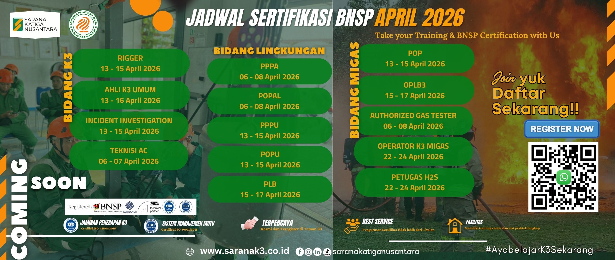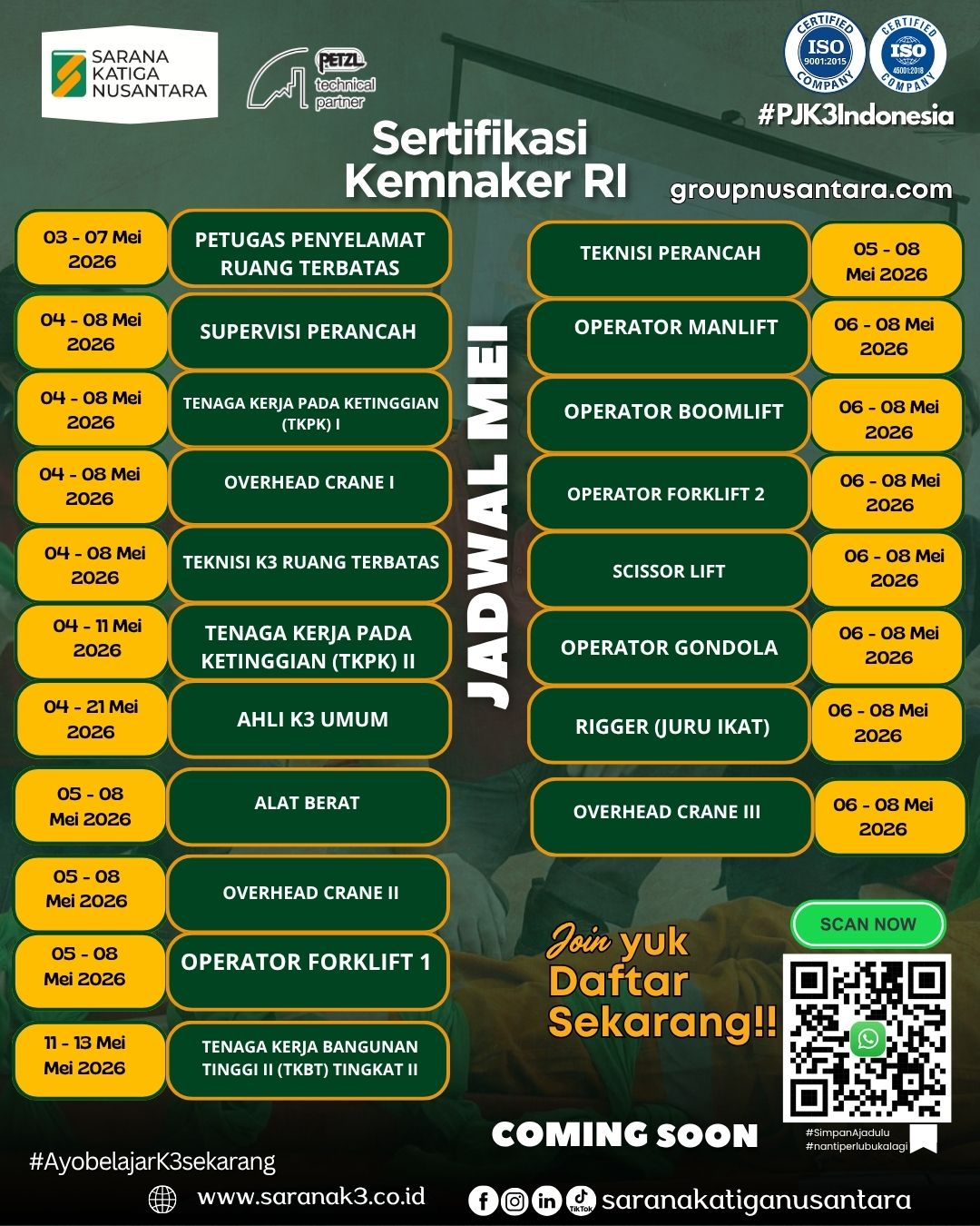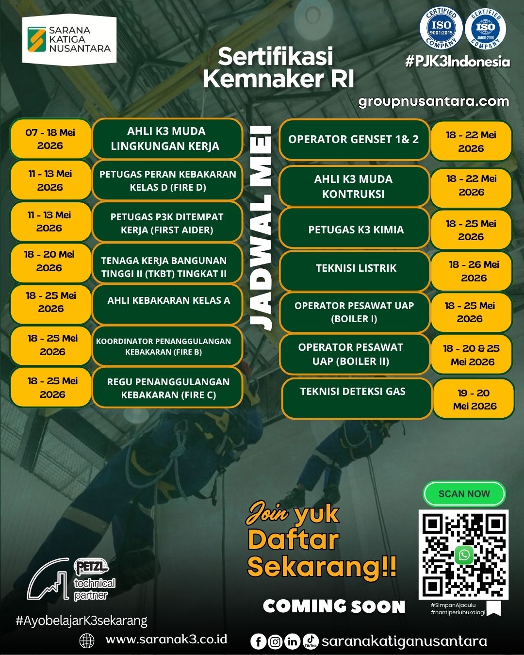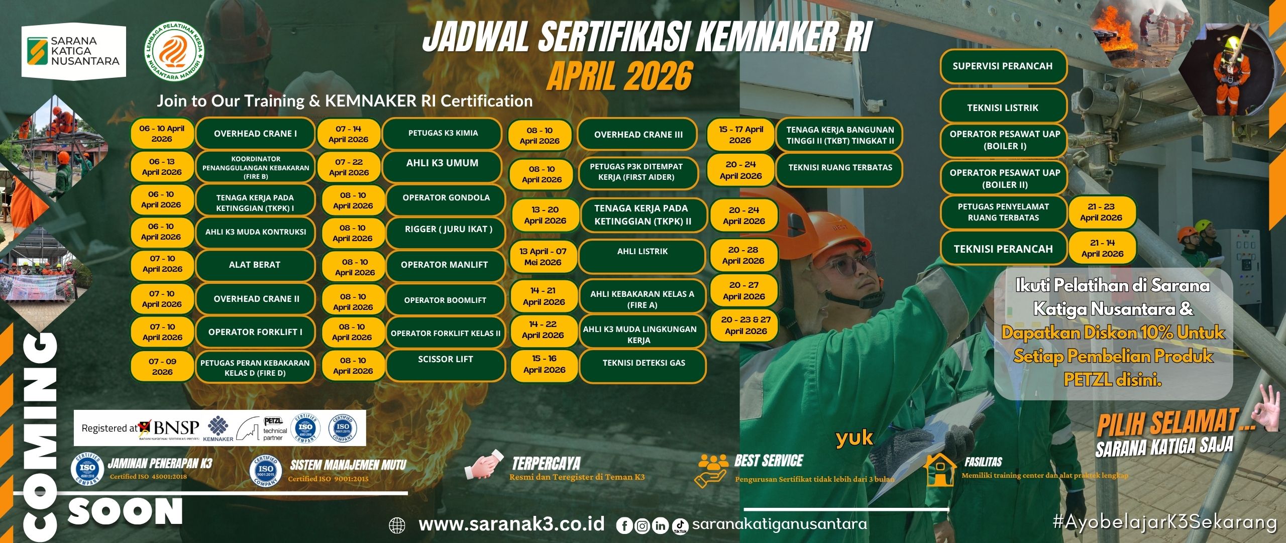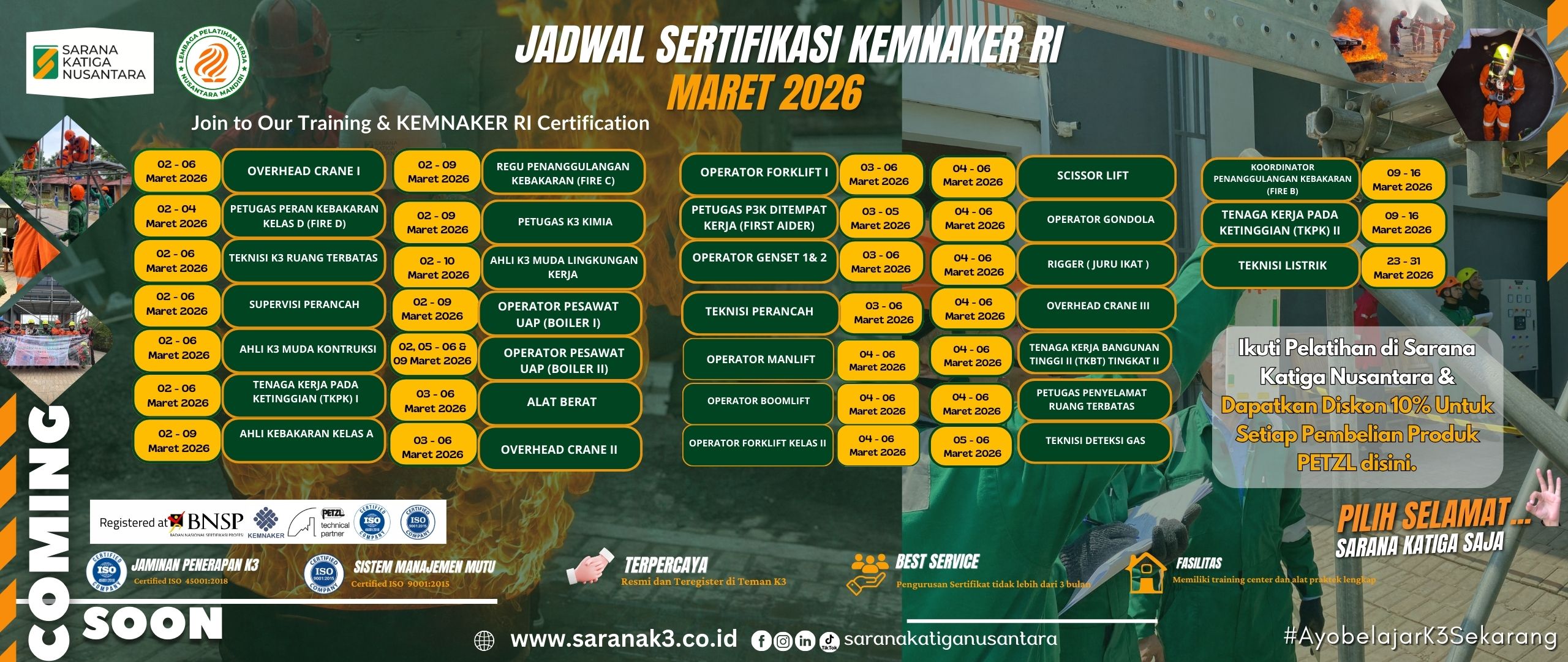PT Sarana Katiga Nusantara adalah lembaga pelatihan dan sertifikasi K3 Umum terbaik No.1 di Indonesia, berizin resmi Kemnaker RI dan terakreditasi BNSP nasional. Sebagai pusat pelatihan K3 di Indonesia, kami menghadirkan program pelatihan dan sertifikasi K3 bersertifikat Kemnaker RI dan BNSP yang diakui secara nasional untuk meningkatkan kompetensi tenaga kerja profesional di berbagai sektor industri, seperti migas, konstruksi, manufaktur, listrik, transportasi, pertambangan, dan logistik. Setiap program dirancang sesuai standar regulasi keselamatan dan kesehatan kerja (K3) agar perusahaan dan pekerja memiliki sertifikat kompetensi resmi yang diakui secara nasional. Layanan kami mencakup pelatihan & sertifikasi Kemnaker RI (Ahli K3 Umum, K3 Listrik, K3 Konstruksi, K3 Kebakaran, K3 Lingkungan, K3 Bekerja di Ketinggian, Pesawat Uap & Bejana Tekan, serta Pesawat Angkat & Angkut) dan sertifikasi BNSP di bidang Migas, Pertambangan, Lingkungan, Industri, serta Keamanan Pangan & Halal. Didukung instruktur berpengalaman, metode pelatihan offline, online, dan hybrid, serta jangkauan nasional, PT Sarana Katiga Nusantara siap menjadi mitra terpercaya dalam pengembangan SDM unggul dan kompeten di bidang Keselamatan dan Kesehatan Kerja (K3) di seluruh Indonesia.