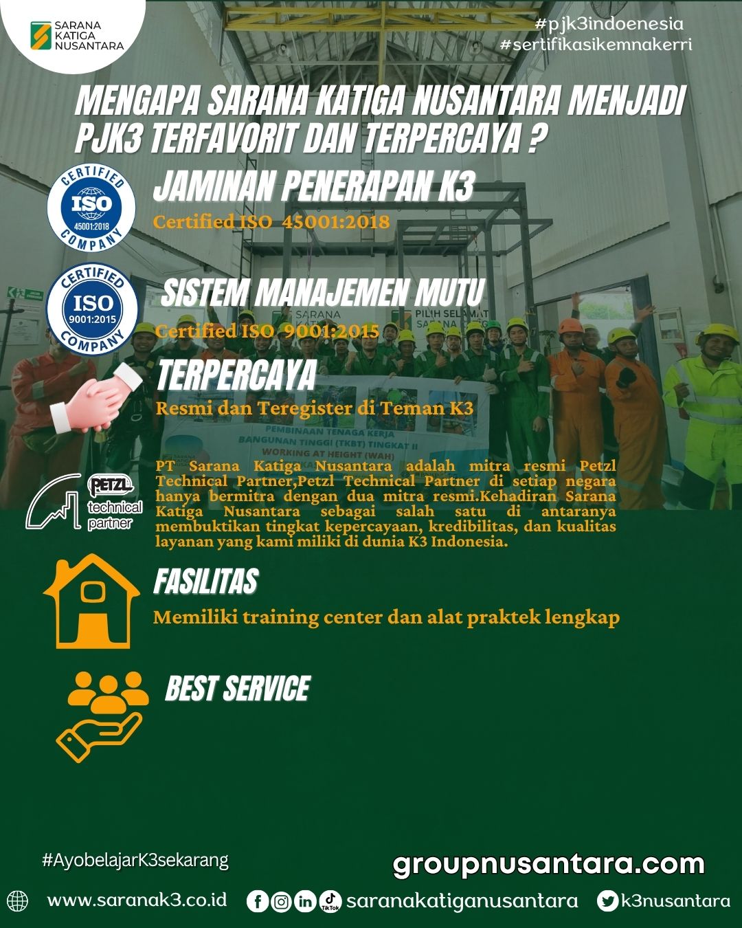 PT Sarana Katiga Nusantara, pusat pelatihan & sertifikasi K3 terbaik No.1 di Indonesia, berizin resmi Kemnaker RI & BNSP. Pilihan tepat untuk peningkatan kompetensi kerja.