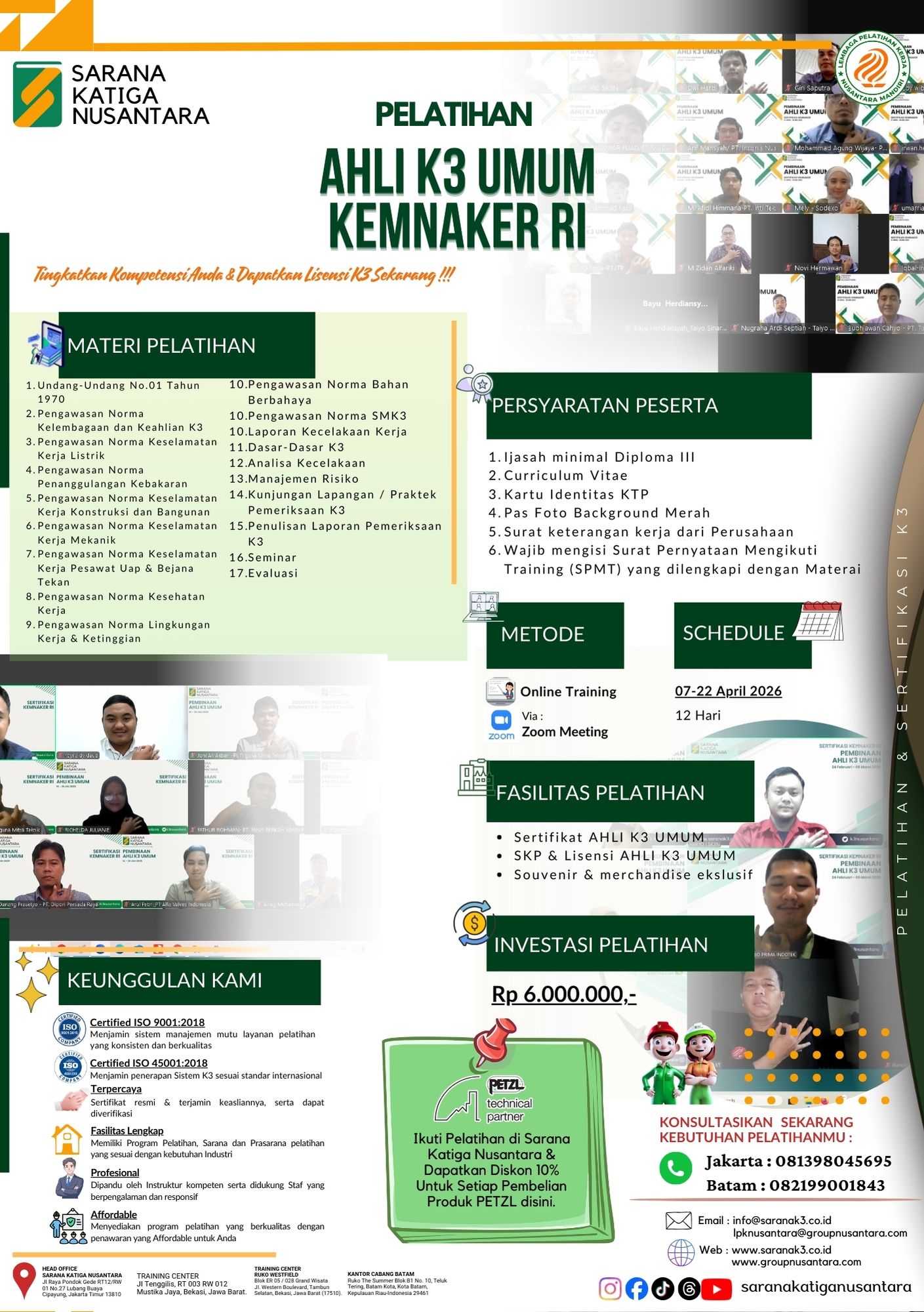 Ikuti pelatihan & sertifikasi K3 resmi Kemnaker RI & BNSP. Daftar sekarang bersama PT Sarana Katiga Nusantara untuk tenaga kerja kompeten & bersertifikat nasional.