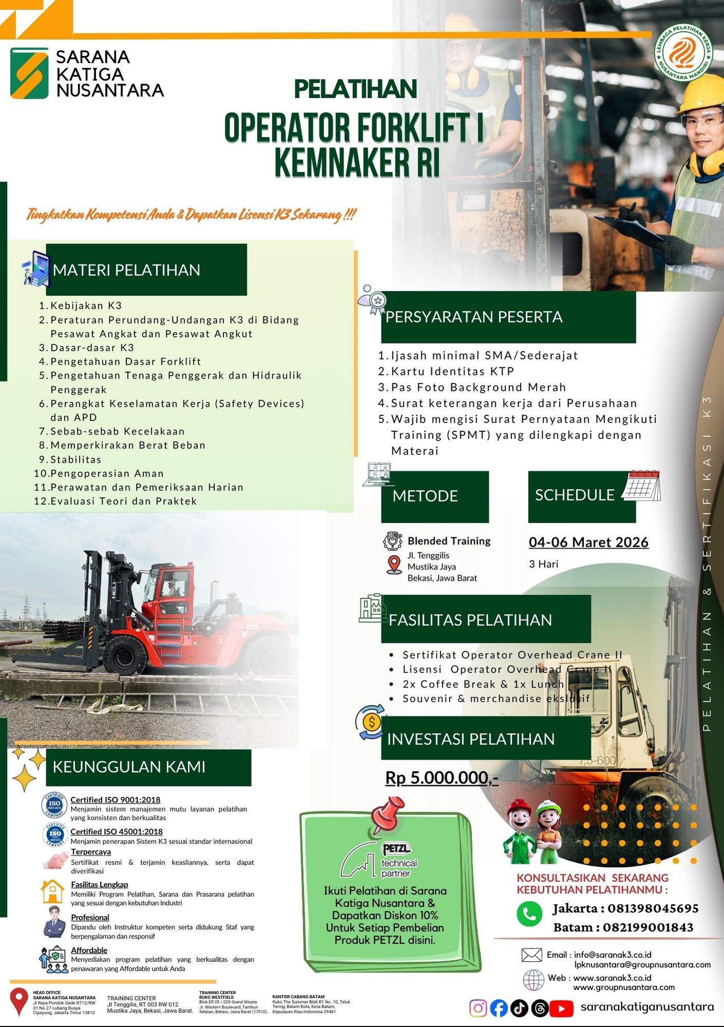 Berdasarkan Keputusan Meteri Tenaga Kerja No.08/MEN/2020 tentang Pesawat Angkat dan Angkut. Salah satu pesawat angkat angkut adalah forklift. Sebagaimana diketahui bahwa saat ini pada umumnya muatan sudah dikemas dalam bentuk unitisasi sehingga penanganann dibutuhkan alat mesin dan umumnya digunakan forklift. Dalam mengoprasikan pesawat angkat forklift dengan aman dan benar maka dibutuhkan tenaga-tenaga operator yang mempunyai skill yang tinggi, dan mempunyai pengetahuan yang cukup tentang dasar-dasar pesawat angkat forklift. Maka dari itu Group Nusantara menyediakan Pelatihan Operator Forklift I yang teregister resmi dari Kemnaker RI.