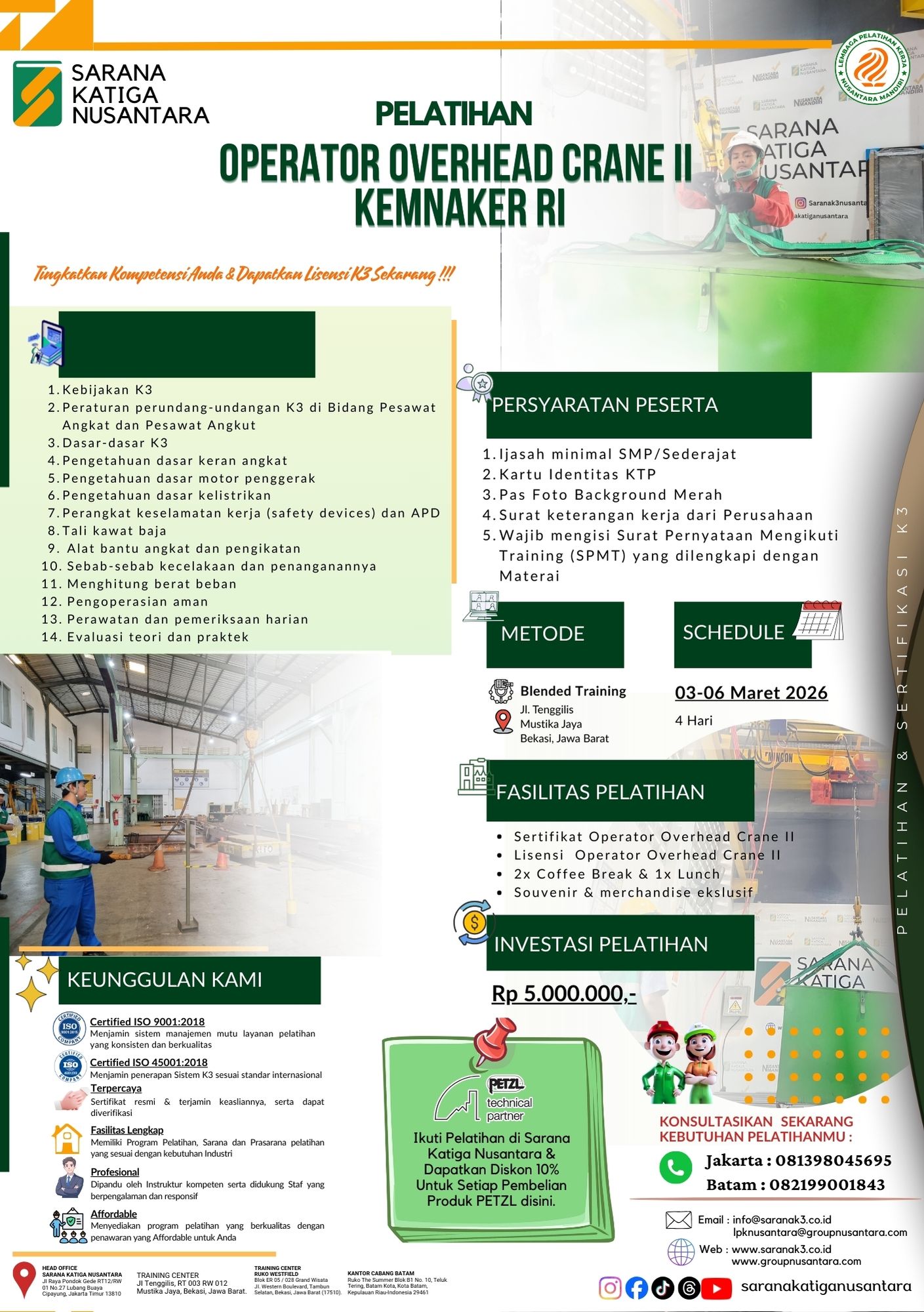 Ikuti pelatihan & sertifikasi K3 resmi Kemnaker RI & BNSP. Daftar sekarang bersama PT Sarana Katiga Nusantara untuk tenaga kerja kompeten & bersertifikat nasional.