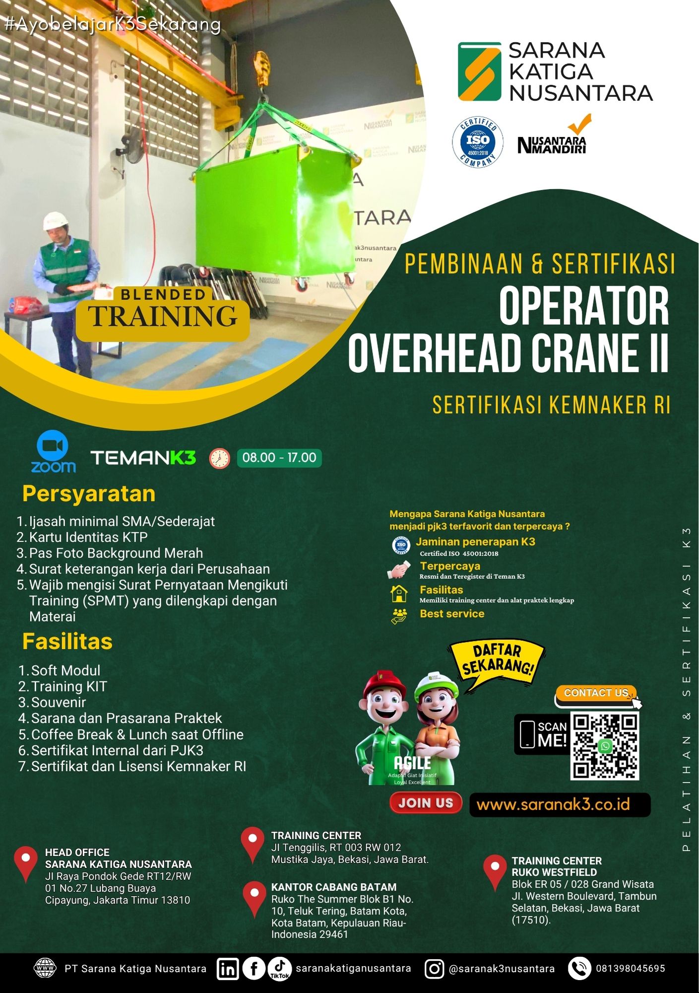 Peraturan Menteri Tenaga Kerja R.I. No. PER.08/MEN/2020 Tentang K3 Pesawat Angkat dan Pesawat Angkut. Hal tersebut yang melatar belakangi PT. SARANA KATIGA NUSANTARA untuk menyelenggarakan pelatihan dan sertifikasi bagi Operator Crane. Sehingga penerapan K3 dapat dilakukan pada kegiatan pengoperasian Crane di Tempat Kerja. PT Sarana Katiga Nusantara telah teregister di Kemnaker RI untuk menyelenggarakan pembinaan, pelatihan dan sertifikasi bagi Operator Crane.