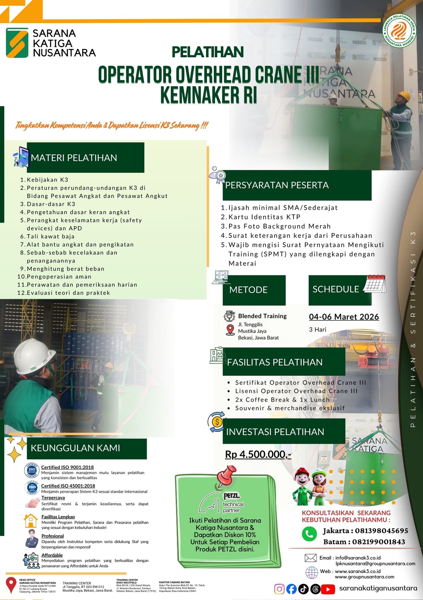 Peraturan Menteri Tenaga Kerja R.I. No. PER.08/MEN/2020 Tentang K3 Pesawat Angkat dan Pesawat Angkut. Hal tersebut yang melatar belakangi PT. SARANA KATIGA NUSANTARA untuk menyelenggarakan pelatihan dan sertifikasi bagi Operator Crane. Sehingga penerapan K3 dapat dilakukan pada kegiatan pengoperasian Crane di Tempat Kerja. PT Sarana Katiga Nusantara telah teregister di Kemnaker RI untuk menyelenggarakan pembinaan, pelatihan dan sertifikasi bagi Operator Crane.