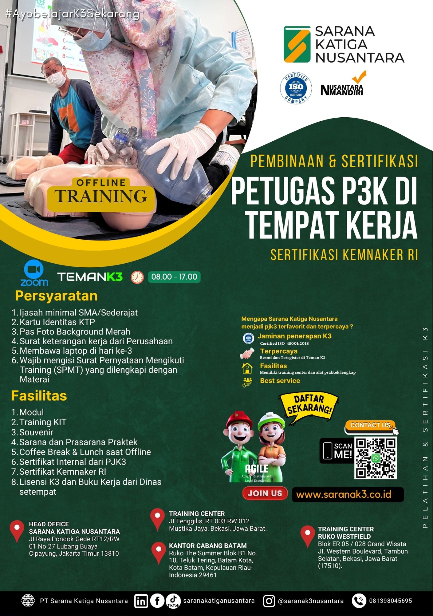 Hal tersebut yang melatar belakangi PT Sarana Katiga Nusantara untuk menyediakan training & sertifikasi petugas P3K (First Aid) untuk bidang keselamatan dan kesehatan kerja (K3). PT. SARANA KATIGA NUSANTARA bekerja sama dengan Kemnaker RI menyelenggarakan Pelatihan Sertifikasi Petugas P3K (First Aid) dengan instruktur yang berkompeten di bidangnya.