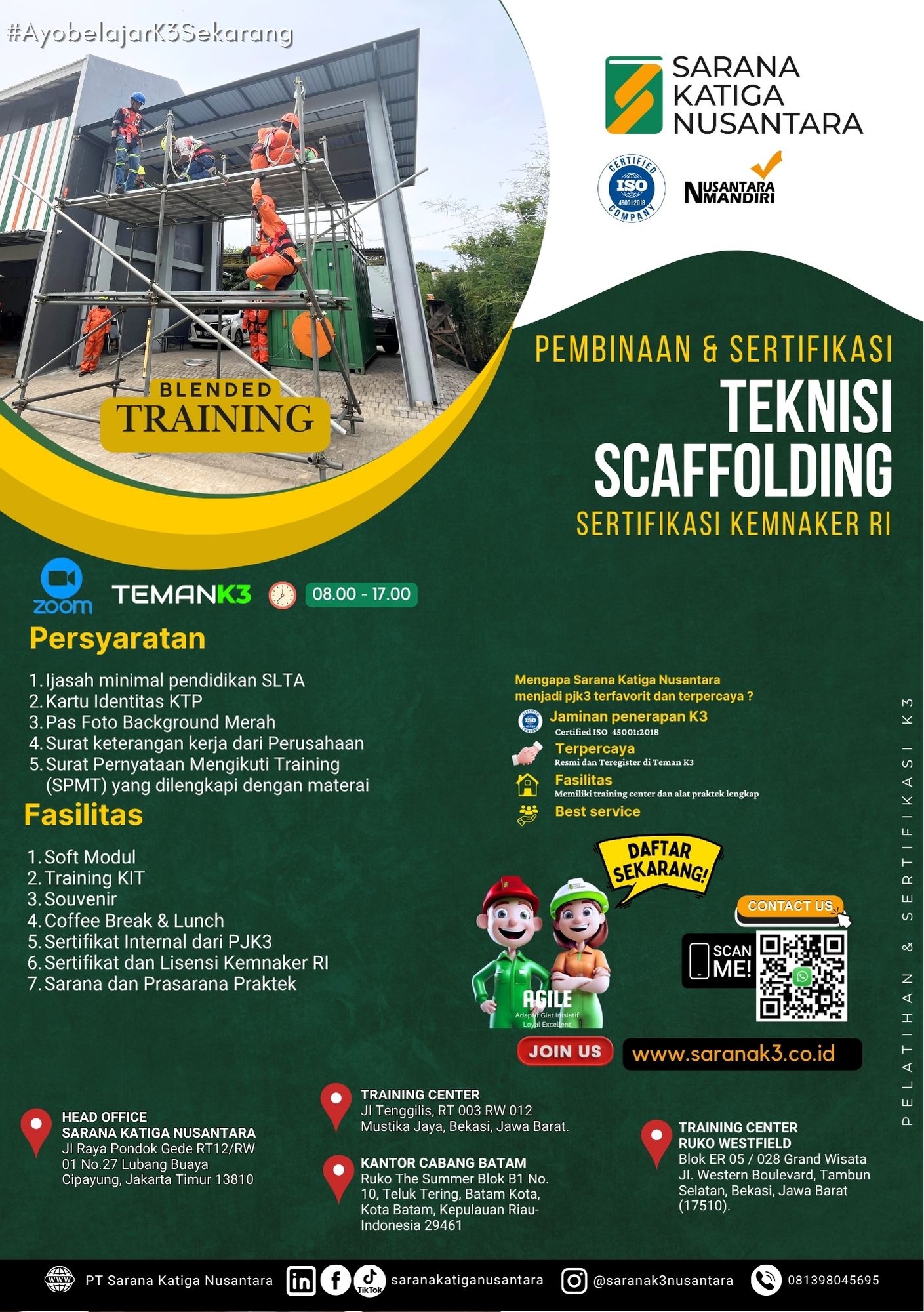 Ikuti pelatihan & sertifikasi K3 resmi Kemnaker RI & BNSP. Daftar sekarang bersama PT Sarana Katiga Nusantara untuk tenaga kerja kompeten & bersertifikat nasional.